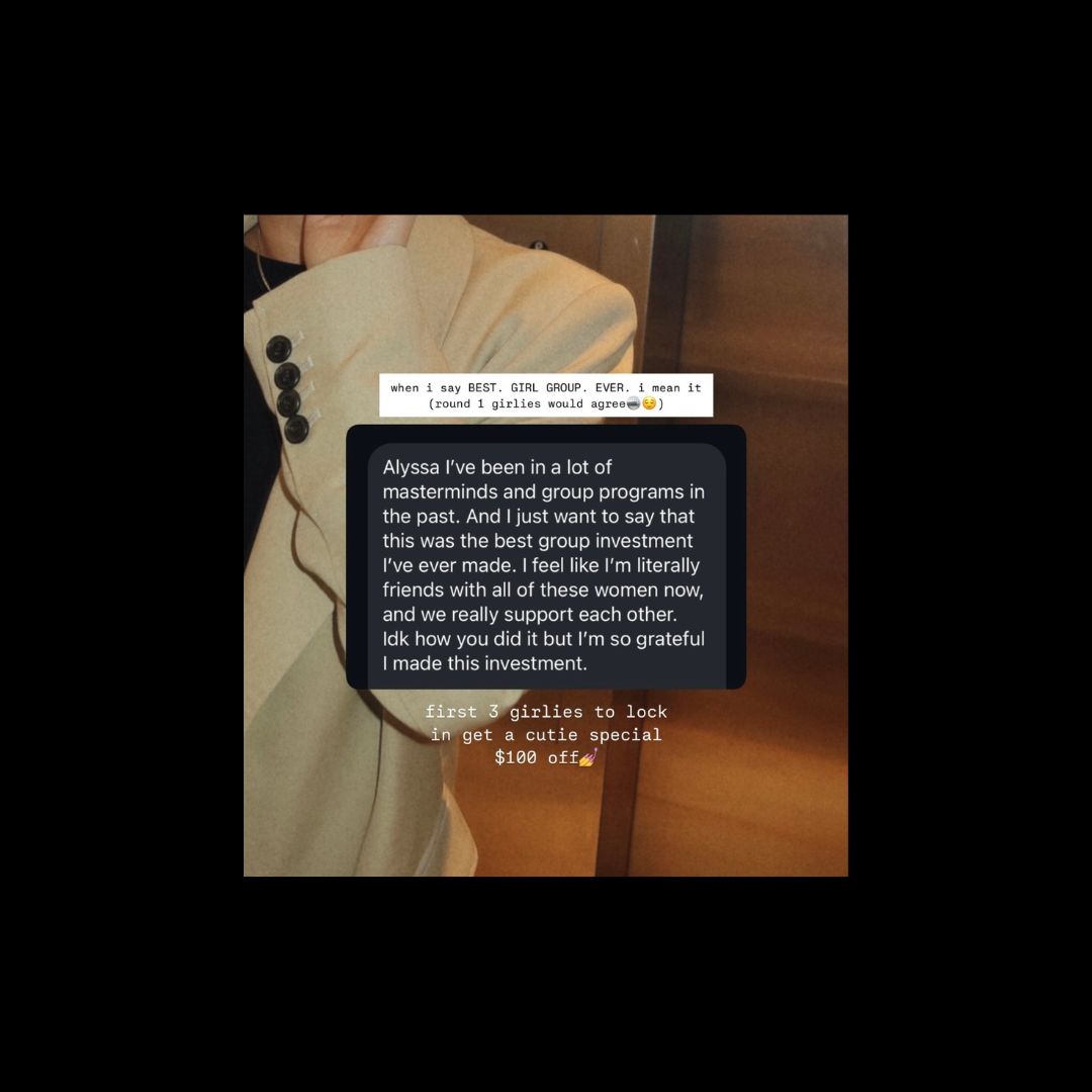General Access includes the weekly live sessions + the community, but there is no 1:1 support between calls. Alyssa won’t be available for communication inside the group.
